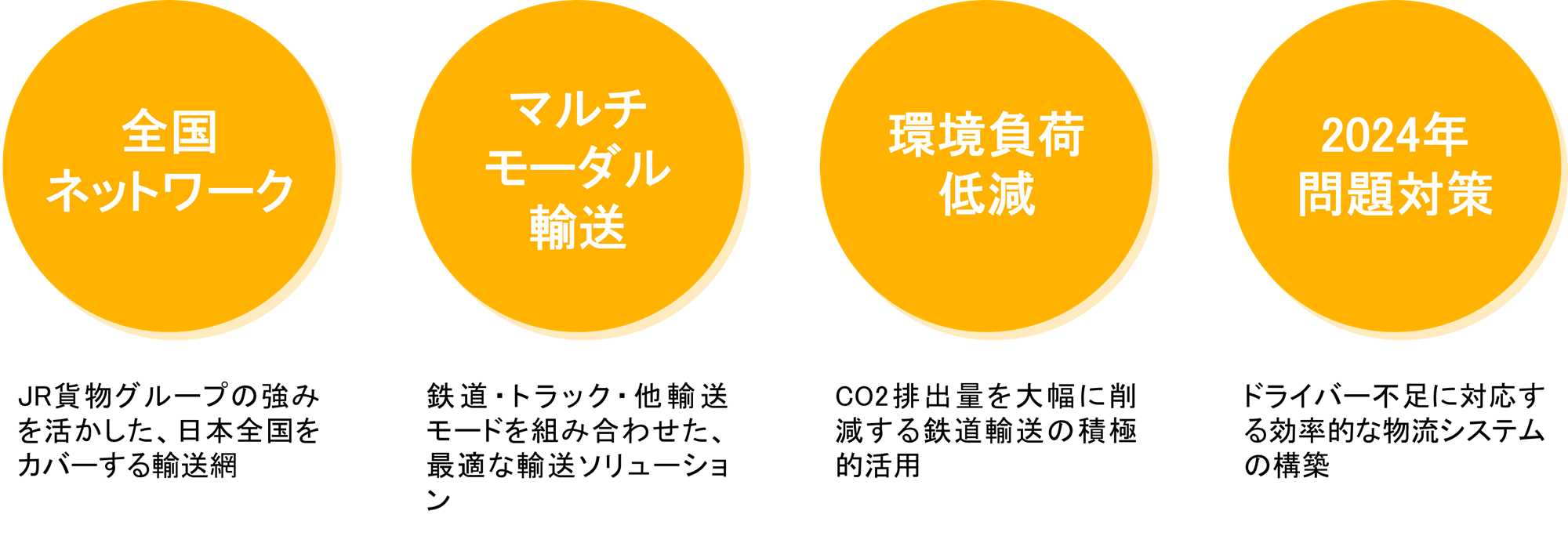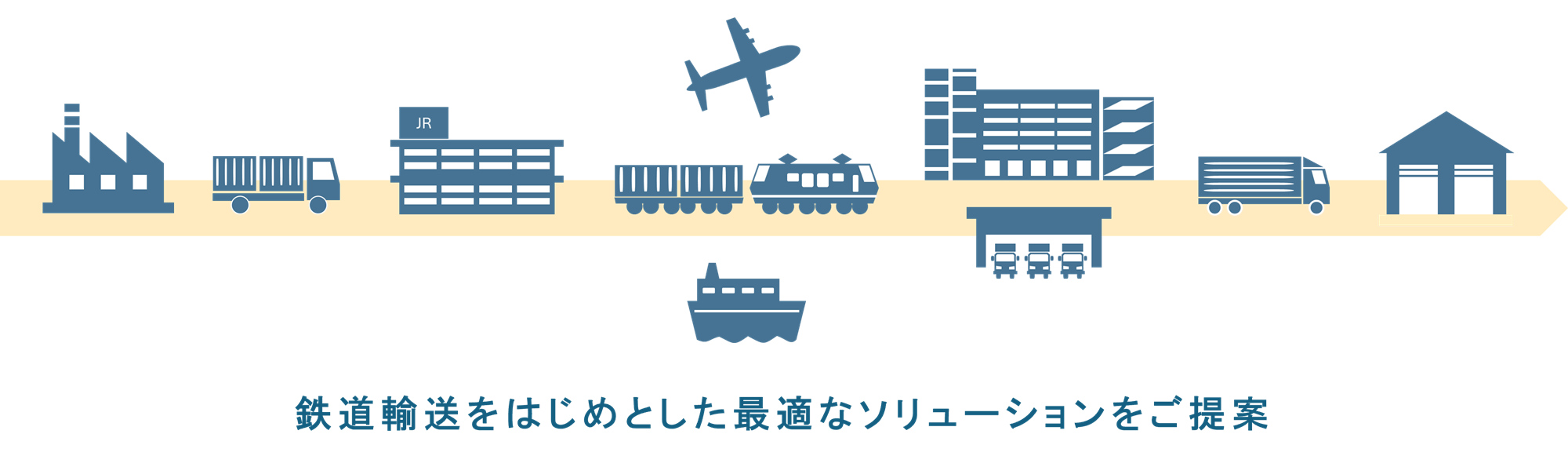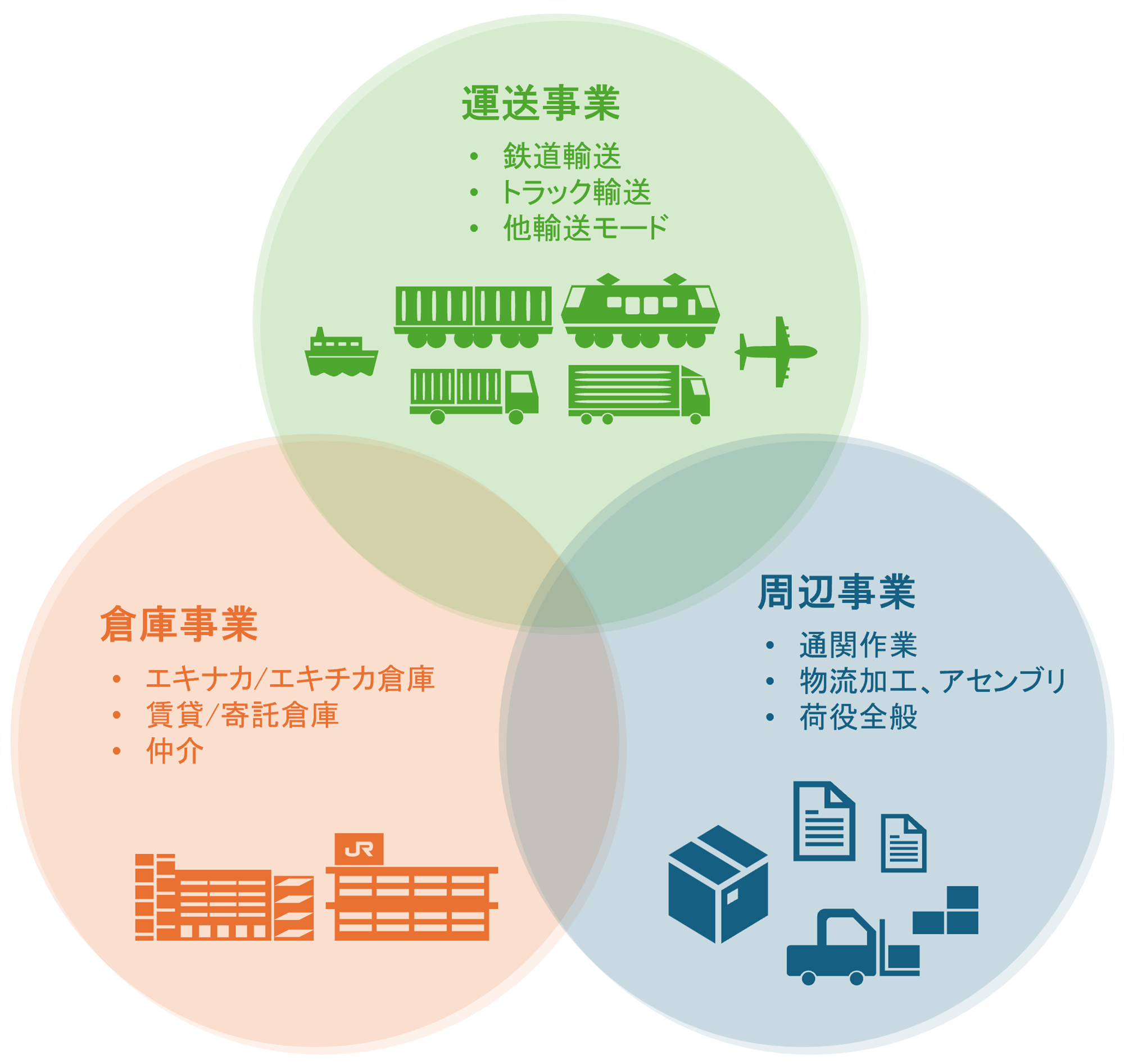 親会社である日本貨物鉄道株式会社(JR貨物)との連携による国内唯一の貨物鉄道輸送と、創業より営んでまいりました倉庫事業を軸に、各ビジネスパートナーとのネットワークも活かしていくことで、お客様のニーズに応じた最適な物流ソリューションを提案いたします。